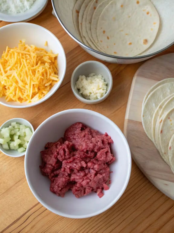 - Lay a tortilla flat and spoon about 1/3 cup of the beef mixture onto the lower third. Top with a sprinkle of both cheeses and some diced onion.