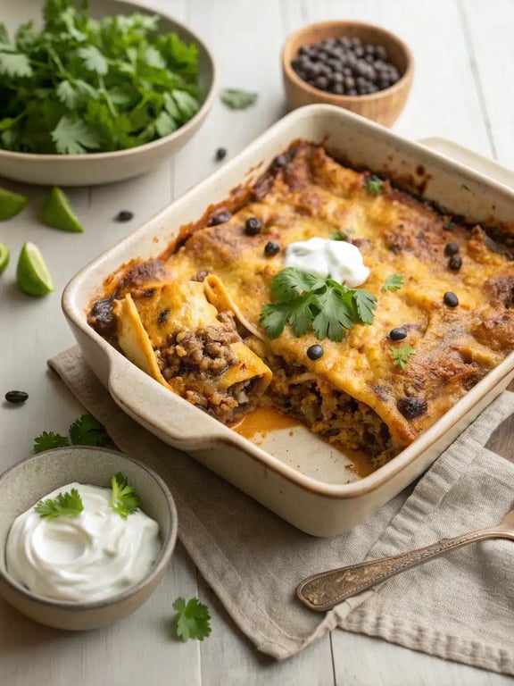 Let the casserole rest for 5-10 minutes before serving to allow the layers to set. Top each portion with a dollop of sour cream and a sprinkle of fresh cilantro.Pro Tips & Tasty Tweaks