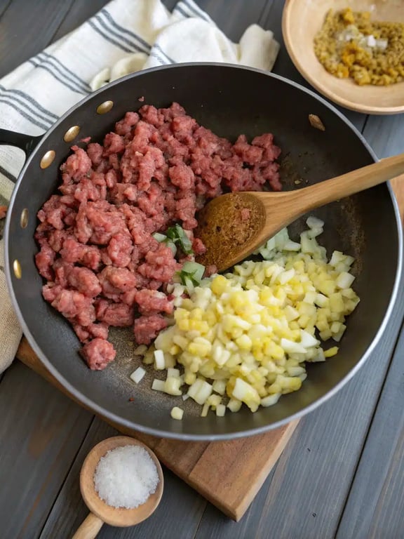 Preheat your oven to 375°F and lightly grease a 9×13 inch baking dish. In a large skillet over medium-high heat, cook the ground beef and diced onion until the beef is browned and the onion is soft, breaking up the meat as it cooks. Drain any excess grease.Step 2: Season and Combine