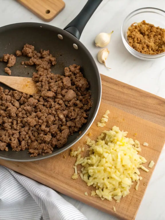 Preheat your oven to 375°F (190°C). Lightly grease a 9×13-inch baking dish.2. Cook the Beef and Aromatics