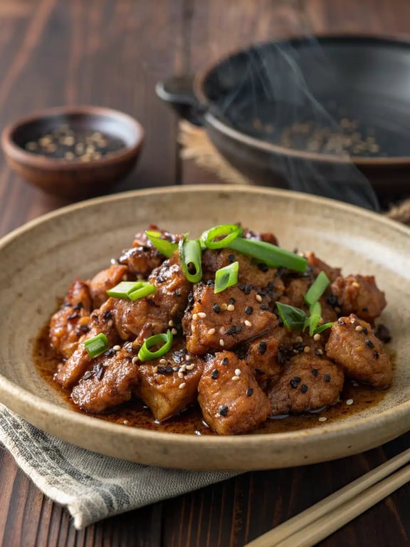 With just a handful of simple ingredients, this black pepper chicken delivers a powerful punch of savory, peppery flavor that's incredibly satisfying. The sauce, built from soy sauce, honey, and a generous amount of freshly ground black pepper, creates a glossy, aromatic coating that clings to tender pieces of chicken.