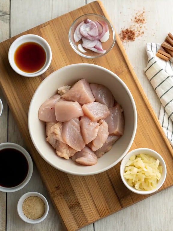 Add the cubed chicken pieces to the bowl and toss thoroughly to ensure every piece is coated in the marinade. Let it sit for 15 minutes at room temperature.