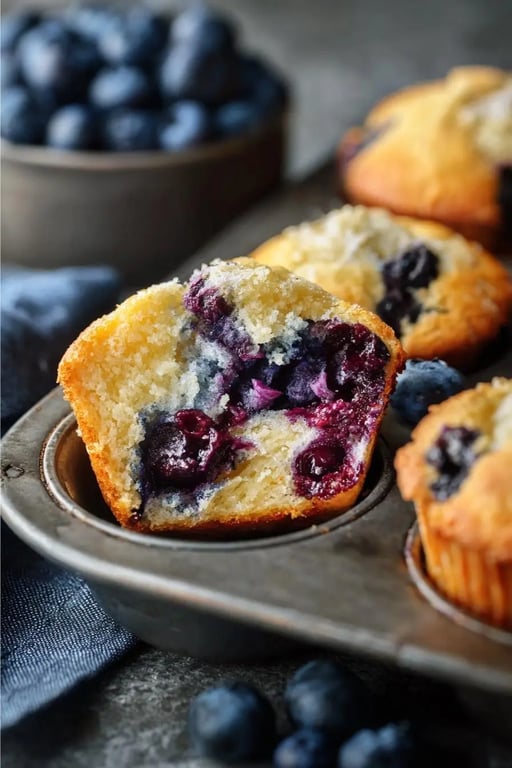 Golden blueberry protein muffins sliced open to reveal juicy berry filling