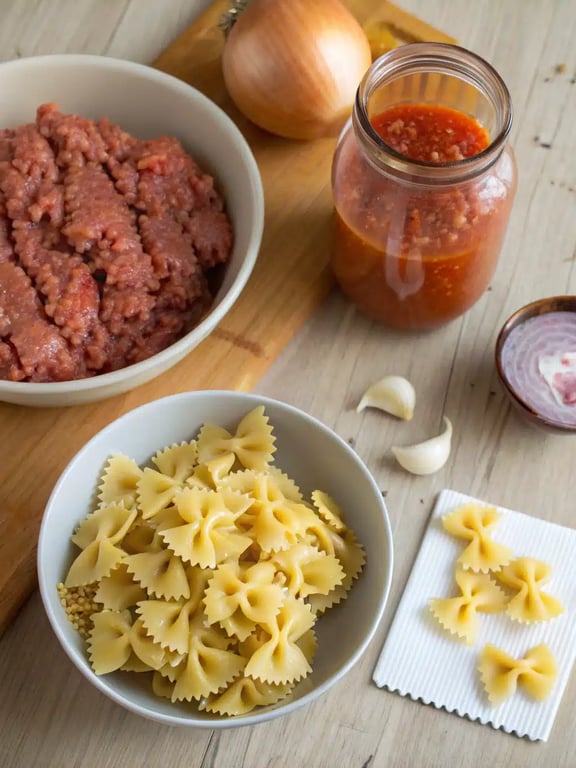 Bring a large pot of salted water to a boil. Add the bowtie pasta and cook according to package directions until al dente, stirring occasionally. Drain well and set aside.Step 2: Brown the Beef and Onion
