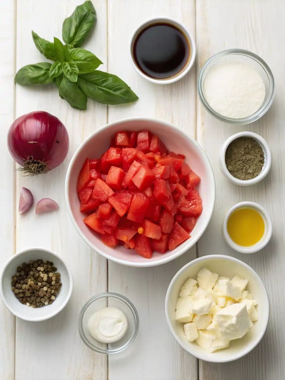 In a medium bowl, combine the drained diced tomatoes, red onion, minced garlic, chopped basil, olive oil, balsamic vinegar, salt, and pepper. Stir gently to mix. Let this bruschetta topping sit for at least 15 minutes to allow the flavors to meld.Step 2: Create the Creamy Base