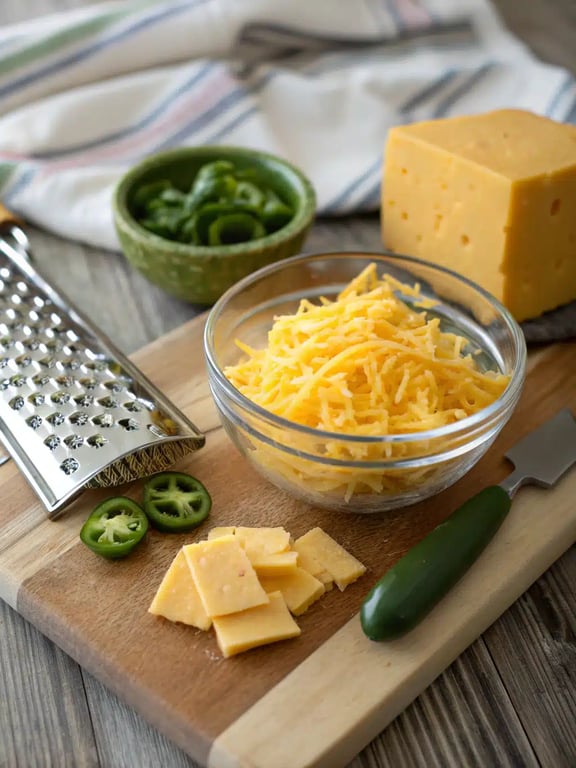 - Gently fold in the shredded cheddar cheese and diced jalapeño until they are evenly distributed throughout the batter.