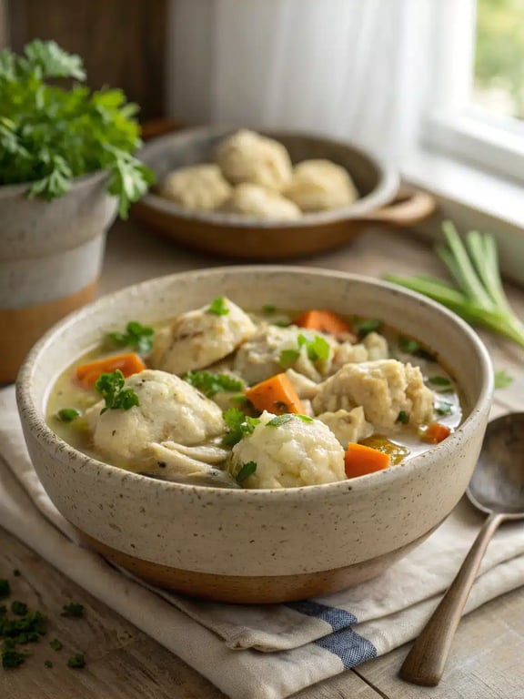 A classic comfort food dish featuring tender chicken and vegetables in a creamy, herb-infused broth, topped with fluffy, cloud-like dumplings. This soul-satisfying meal is perfect for a cozy weeknight dinner.