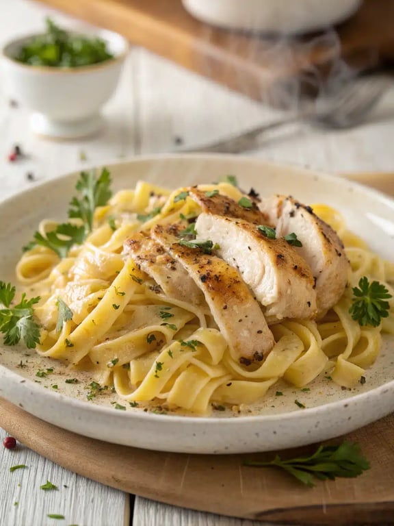 When you make this Chicken pasta recipe correctly, the flavor and texture should be perfectly balanced. The savory, well-seasoned chicken pairs beautifully with the rich, buttery sauce. You’ll notice a wonderful garlic aroma that fills your kitchen, promising a truly comforting meal. Texture-wise, the chicken should be tender and juicy on the inside with a lightly golden crust. The noodles should be perfectly al dente, coated in a silky, emulsified sauce that clings without being heavy or greasy. The fresh parsley adds a bright, clean finish that cuts through the richness, making every bite of these creamy chicken noodles delightful.Variations & Substitutions