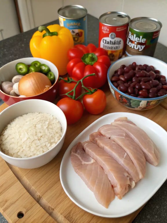 Pour the chicken broth over the rice and vegetable layer, then spoon the chicken and pepper mixture evenly over the top.