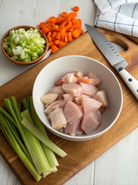 Sprinkle flour over the chicken and vegetable mixture, stirring constantly for 1 minute to cook out the raw flour taste. Gradually pour in chicken broth and milk, stirring continuously until the sauce thickens and becomes smooth.