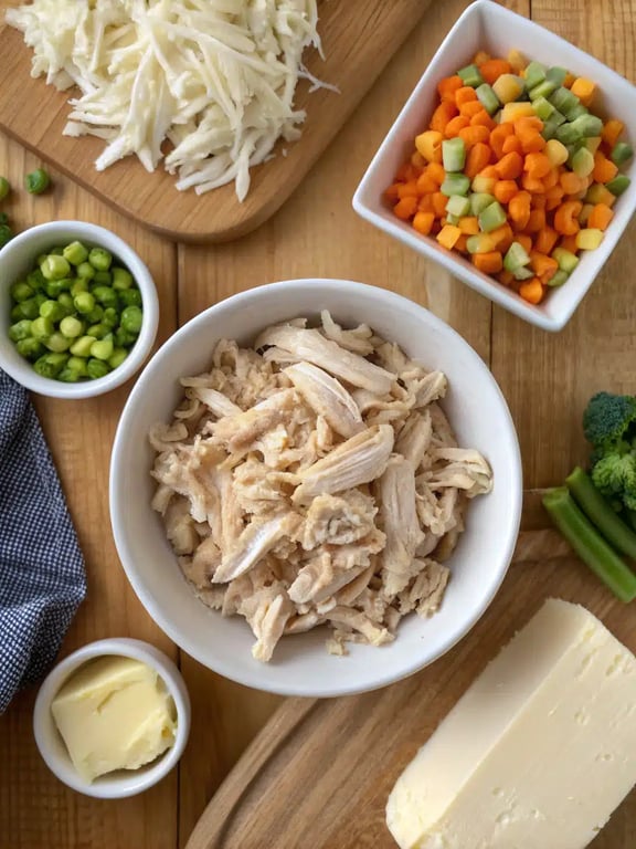 Gathering your ingredients is the first step to creating this comforting classic. We love how this list uses mostly pantry and freezer staples, making it an easy chicken pot pie to whip up without a special grocery trip.- 2 cups cooked chicken, shredded or diced