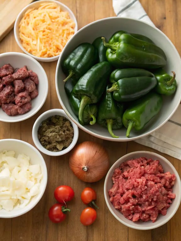 Arrange the peeled poblano peppers in a single layer in the bottom of a 9×13-inch baking dish. Spoon the beef and tomato mixture evenly over the peppers.Step 6: Add the Final Layers
