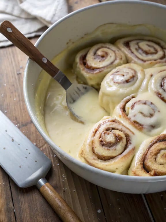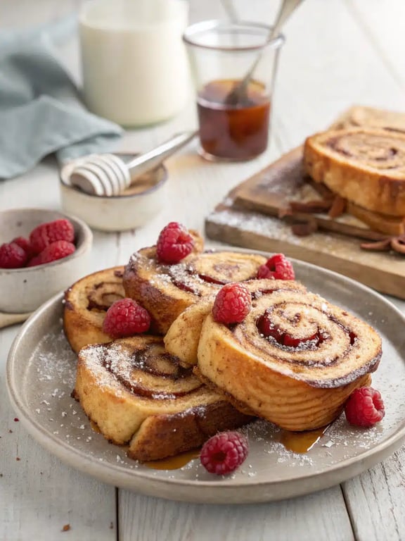For best results, use day-old cinnamon rolls as they hold their shape better when soaked. Don’t rush the soaking time – this ensures the bread absorbs the custard properly. If pieces brown too quickly, reduce heat to medium-low. Leftovers reheat well in a toaster oven or air fryer.