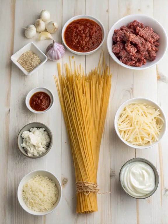 Here’s everything you’ll need to make this creamy spaghetti casserole. We recommend full-fat dairy for the richest flavor and creamiest texture, but you can use lighter versions if you prefer.- 12 ounces dried spaghetti