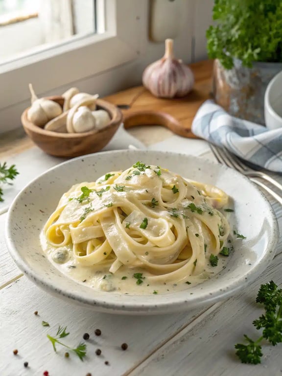 Creamy garlic pasta with fettuccine, tossed in a rich Parmesan sauce and finished with fresh parsley for a quick, elegant dinner.
