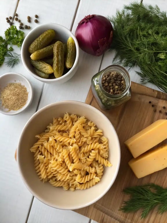 Ingredients for dill pickle pasta salad