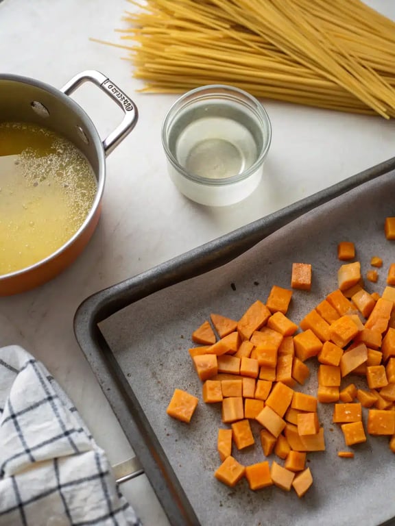 - While pasta cooks, toss sweet potato cubes with 1 tablespoon olive oil and roast at 400°F for 20 minutes until tender and slightly caramelized at the edges. Let cool completely.