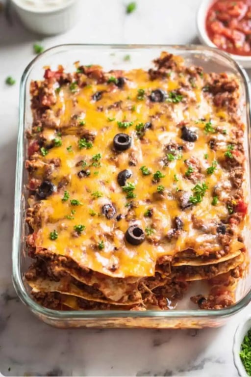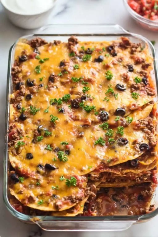 - Layer it up: Spoon some beef mixture into a 9×13 baking dish, add six tortillas, more beef, and half the cheese. Repeat with another tortilla layer, top with remaining beef and cheese.