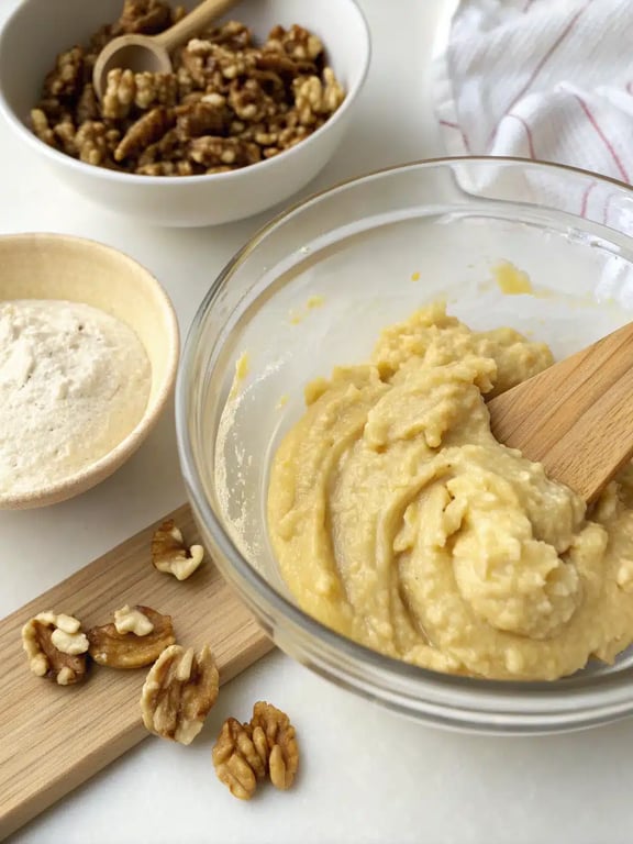 Gently fold the dry flour mixture into the wet ingredients using a spatula, mixing only until no dry streaks remain, being careful not to overmix. Then, fold in the chopped walnuts.Step 6: Portion the Batter