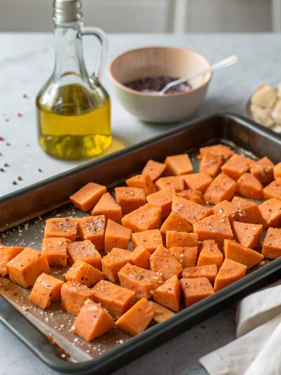 Preheat your oven to 400°F. Toss the diced sweet potato with 1 tablespoon olive oil, salt, and pepper on a baking sheet, then roast for 20-25 minutes until tender and lightly browned, stirring once halfway through.