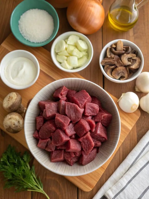 Here’s everything you’ll need to create this classic comfort food. We love the earthy depth that the beef tips mushrooms add, but feel free to see our variations section if you want to switch things up.- 1 ½ pounds beef stew meat, cut into 1-inch cubes