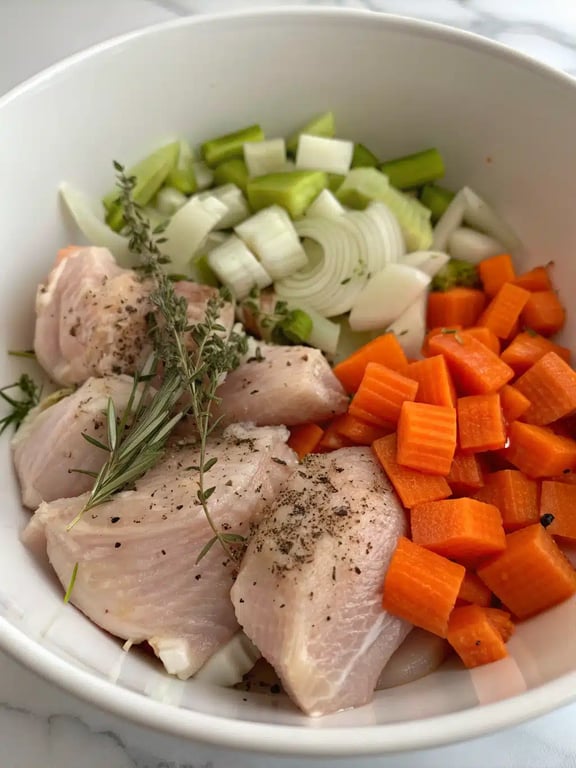 - Add the chicken pieces, carrots, celery, thyme, rosemary, salt, and pepper. Stir and cook for 4-5 minutes until the chicken is no longer pink on the outside.