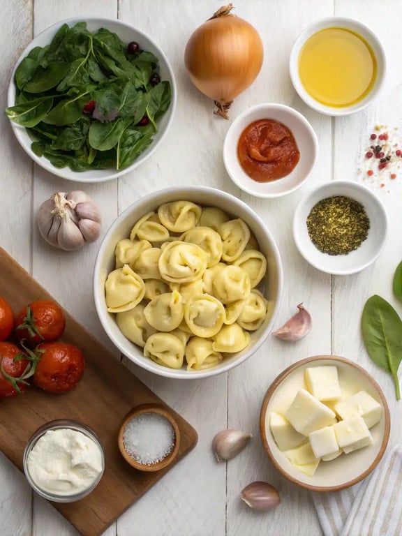 - Add the fresh spinach and cooked tortellini to the skillet, tossing gently until the spinach is wilted and everything is coated in the creamy sauce. Season with salt and pepper to taste.