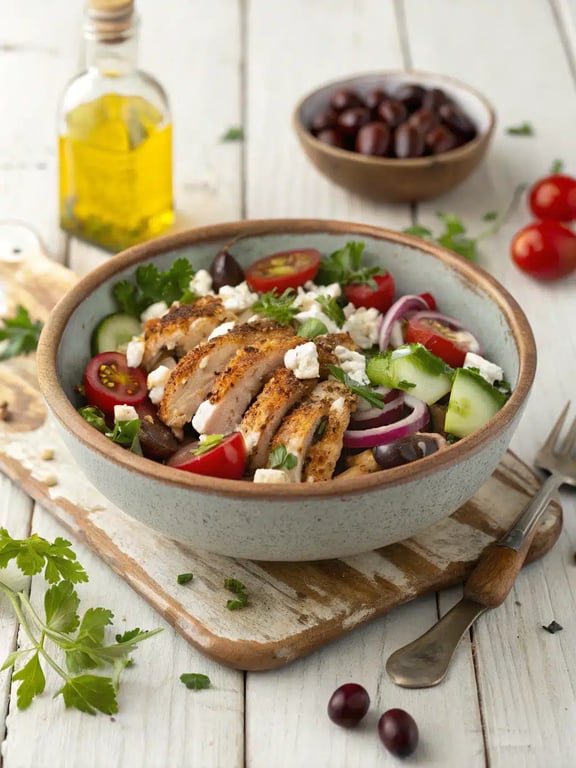 Our Mediterranean chicken salad is a creamy, protein-packed meal with Kalamata olives and fresh veggies, served chilled on a bed of greens or in a pita pocket.