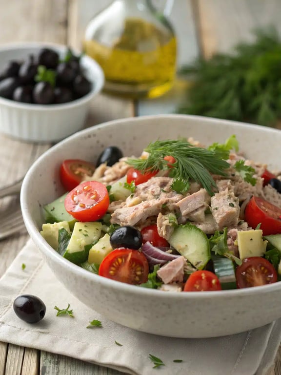 A bright, satisfying Mediterranean tuna salad with flaky tuna, crisp cucumber, briny olives, and fresh herbs in a creamy, lemony dressing. Perfect for a quick lunch, light dinner, or meal prep.