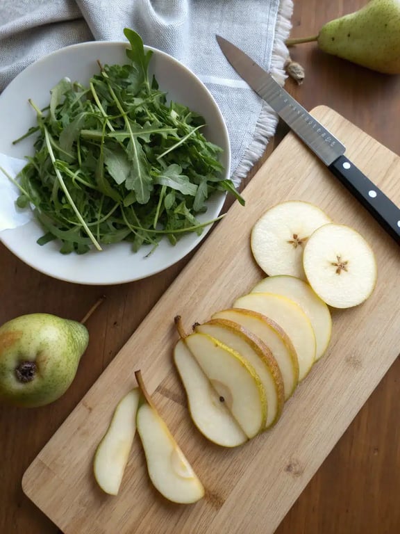 - In a large salad bowl, combine the fresh arugula and thinly sliced pears. A gentle touch here helps prevent the arugula from wilting and the pears from bruising.
