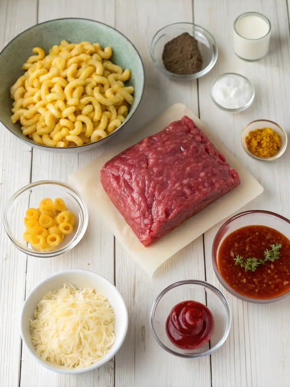 Aqui está tudo o que você precisa para preparar esta deliciosa receita. macarrão com carne moída Obra-prima. Recomendamos uma mistura de carne moída 80/20 para o melhor equilíbrio de sabor e suculência.- 1 libra de carne moída (mistura 80/20 recomendada)