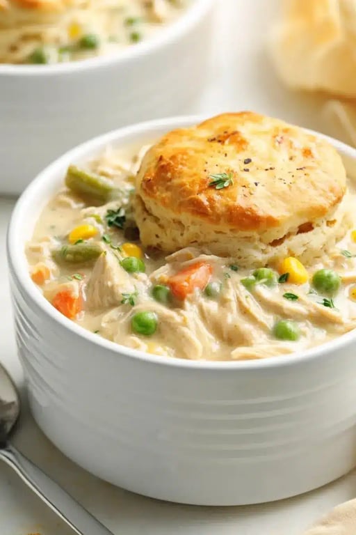9. Serve: Spoon the creamy pot pie mixture into bowls and top each with a golden biscuit.