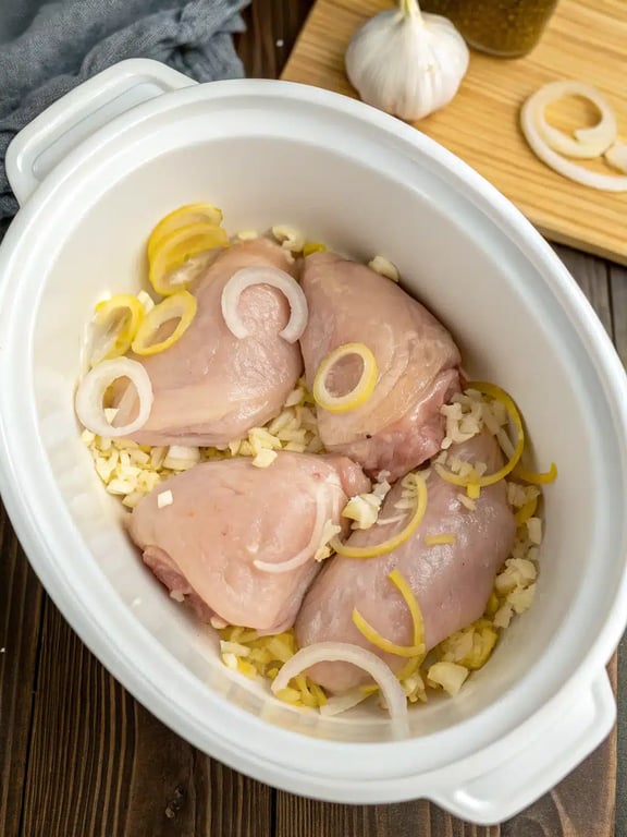 - Place the chicken thighs, sliced onion, and minced garlic into the slow cooker insert.