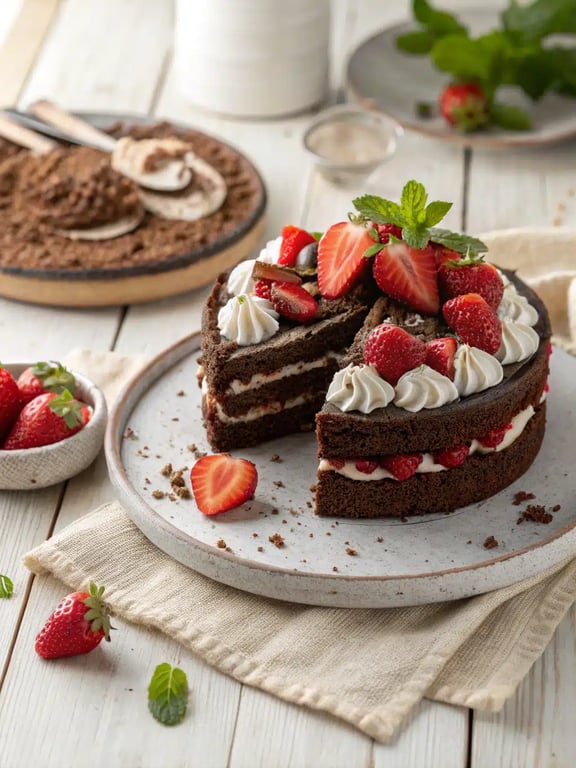 To assemble, place one cake layer on a serving plate. Arrange half of the sliced strawberries evenly over the top. Place the second cake layer over the strawberries, then cover the entire cake with the chocolate ganache, allowing it to drip slightly down the sides.Step 8: Final Decoration