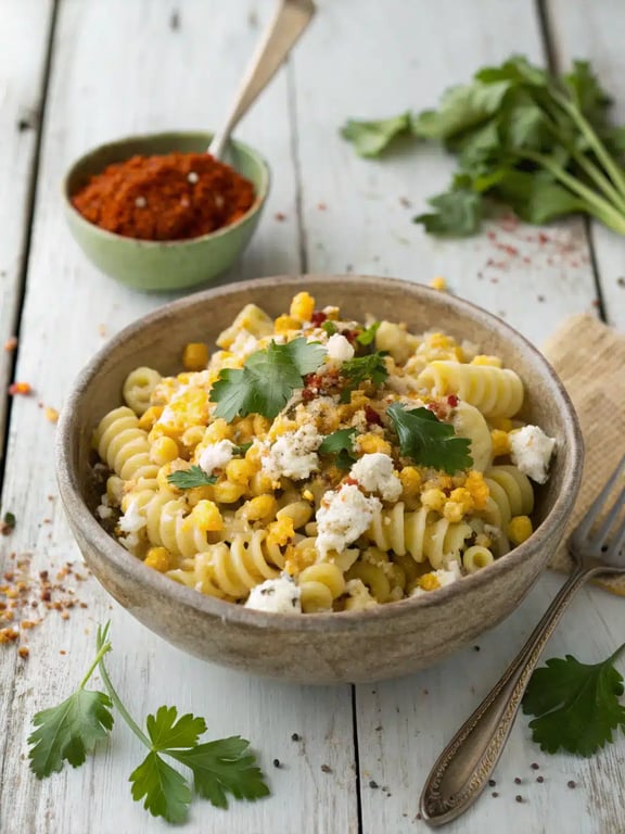 Our team always gets compliments when we bring this creamy corn pasta to gatherings. One of our favorite serving tricks is to garnish with extra crumbled cotija and a sprinkle of chili powder right before serving for that beautiful finished look.