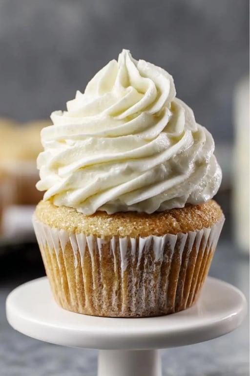 Sugar free vanilla cupcake with creamy frosting on pedestal stand