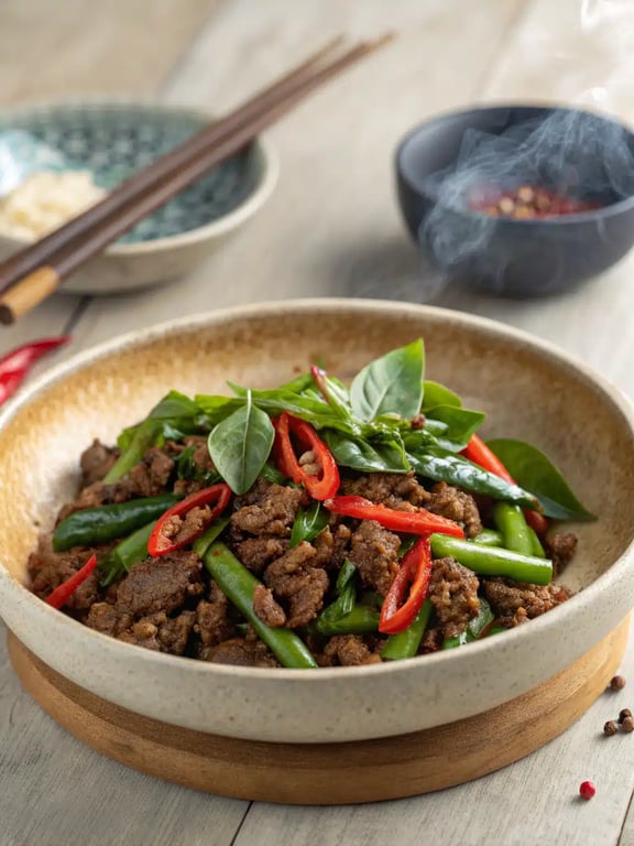 When you get your Thai basil beef just right, it’s a beautiful symphony of contrasts. The flavor profile is a bold balance: deeply savory and salty from the sauces, with a subtle sweetness and a clean, spicy kick from the chilies. Meanwhile, the star of the show is the anise-like aroma of the fresh basil, which should be pronounced but not cooked away. Texture is equally important here. You’re aiming for tender, juicy beef with a slight sear, vegetables that are softened but still have a pleasant snap, and a sauce that clings to every element in a shiny, glossy coat. The final dish should be moist but not soupy. If your sauce seems too thin, let it simmer for an extra 30 seconds to reduce and thicken beautifully.Variations & Substitutions