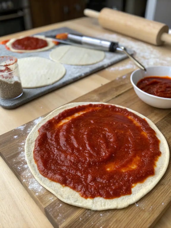 Getting your oven hot and your baking sheet ready first makes the assembly process smooth and efficient.Step 2: Lay the tortillas flat and spread about 2 tablespoons of pizza sauce evenly over each one, leaving a small border around the edges.