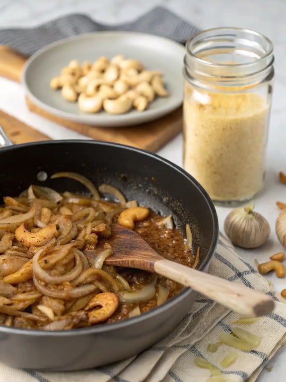 - In a high-speed blender, combine the soaked cashews, nutritional yeast, lemon juice, salt, pepper, and the onion-broth mixture from the skillet. Blend until completely smooth and creamy.